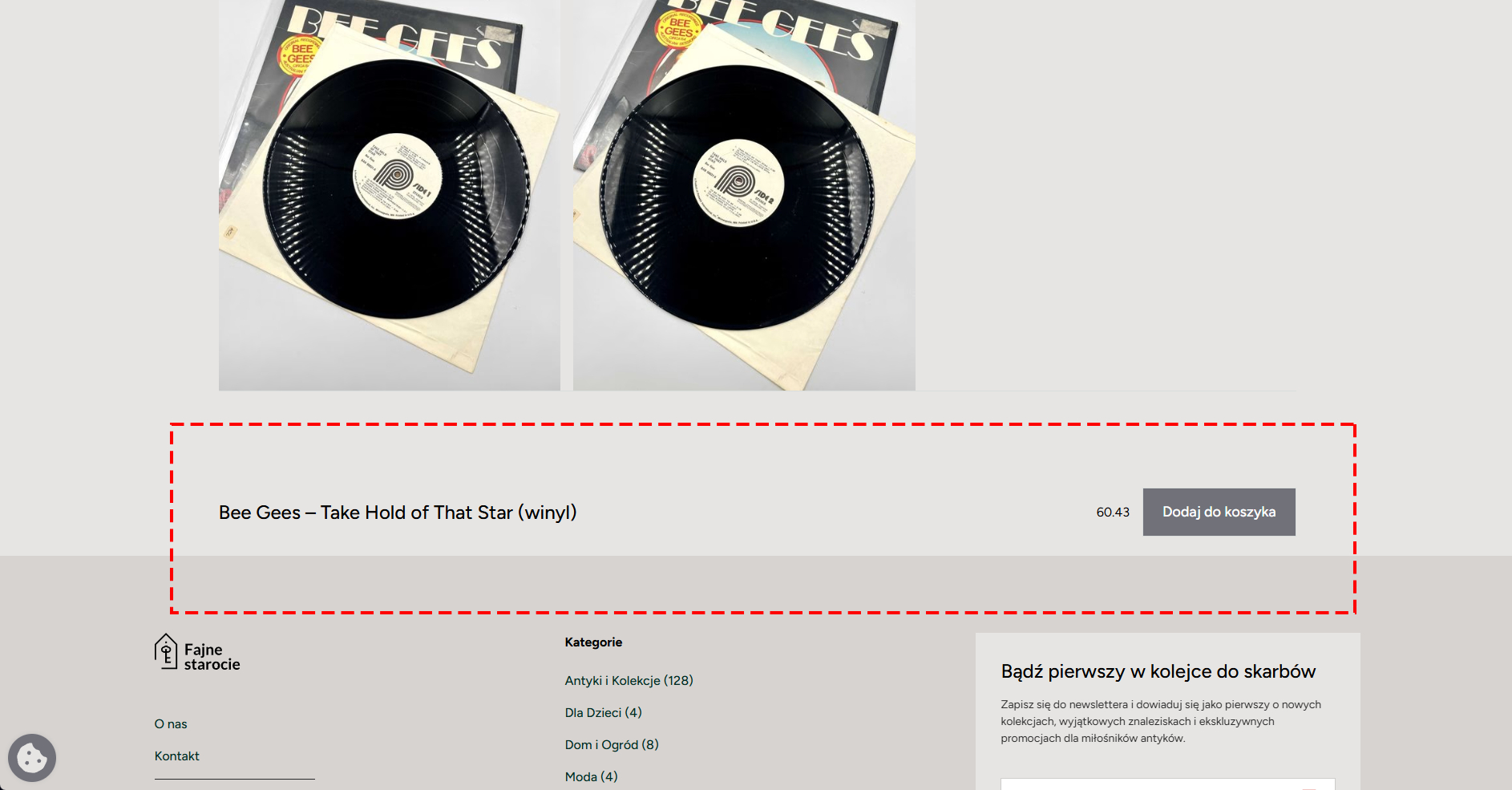 Weźmy na tapet stronę fajnestarocie.pl. Mamy widok produktu gdzie po prawej zauważymy cenę, tytuł oraz przycisk zakupu. Chcemy, aby te elementy były zawsze widoczne na stronie a zastosowanie position sticky nie wszędzie jest możliwe i też nie chce do tego używać gsapa, scrollTriggera i opcji pin.